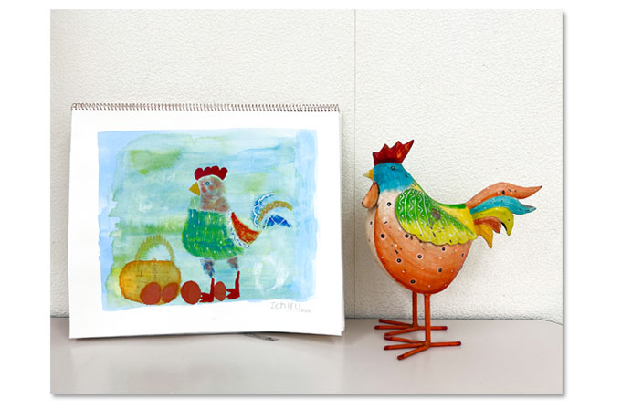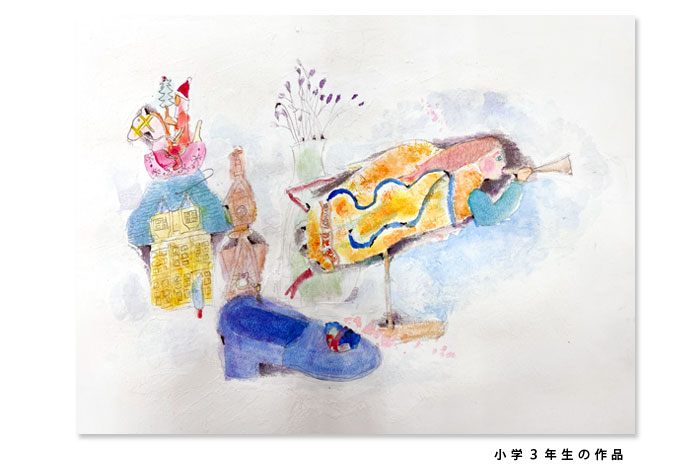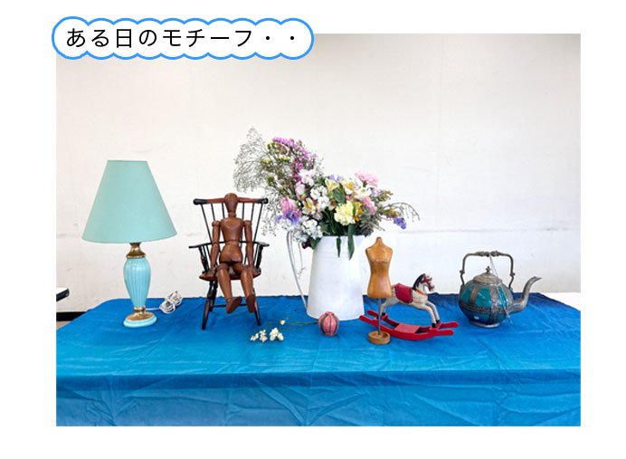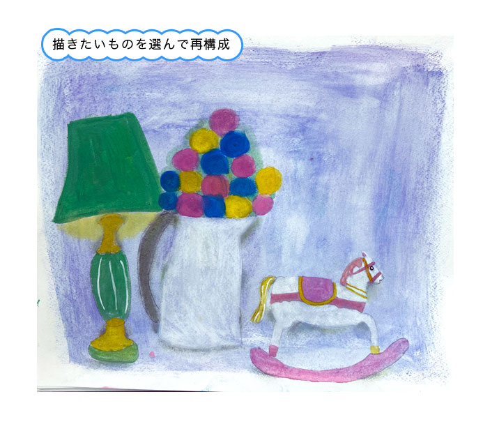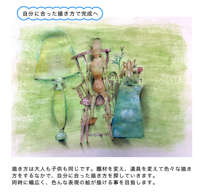 授業内容▼ 教室で用意したモチーフを、主に鉛筆、水彩絵具、パステルを用いて描きます。1回、約2時間の授業で1作品を完成させます。